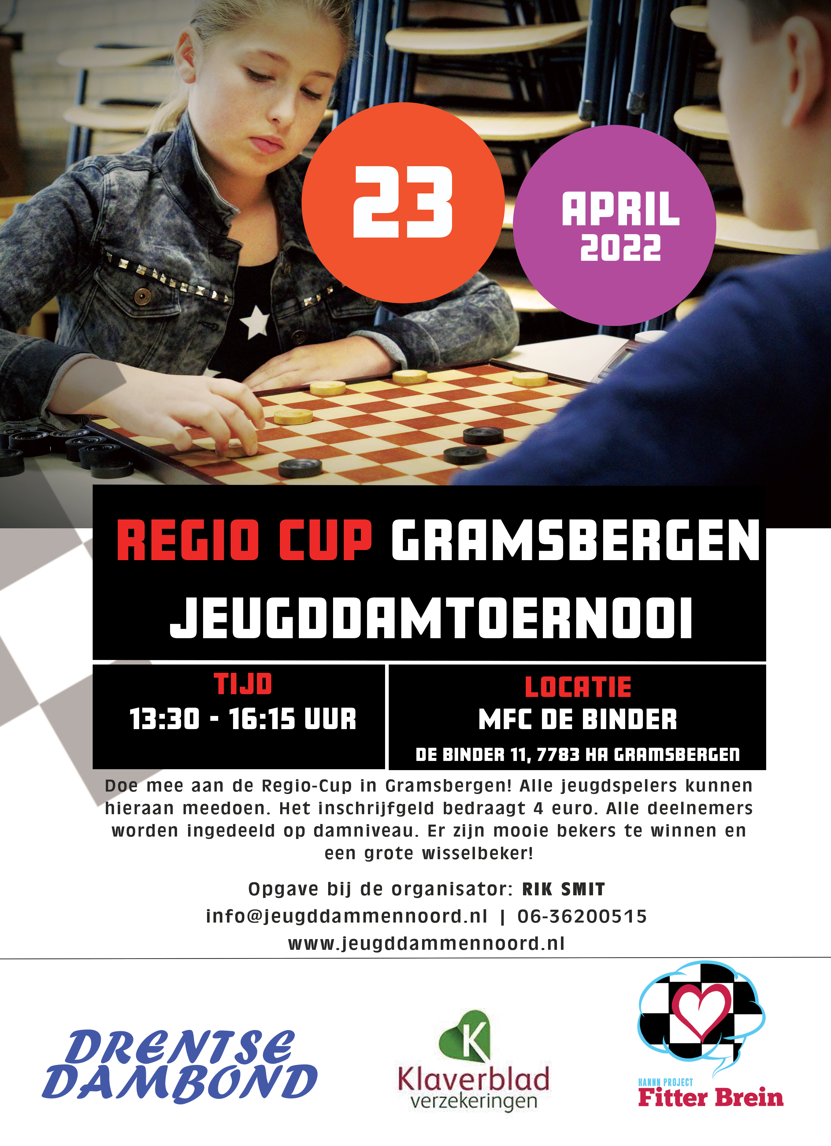 Inschrijven kan door naam, rating en damclub en welk of welke toernooien u mee wilt doen te vermelden.