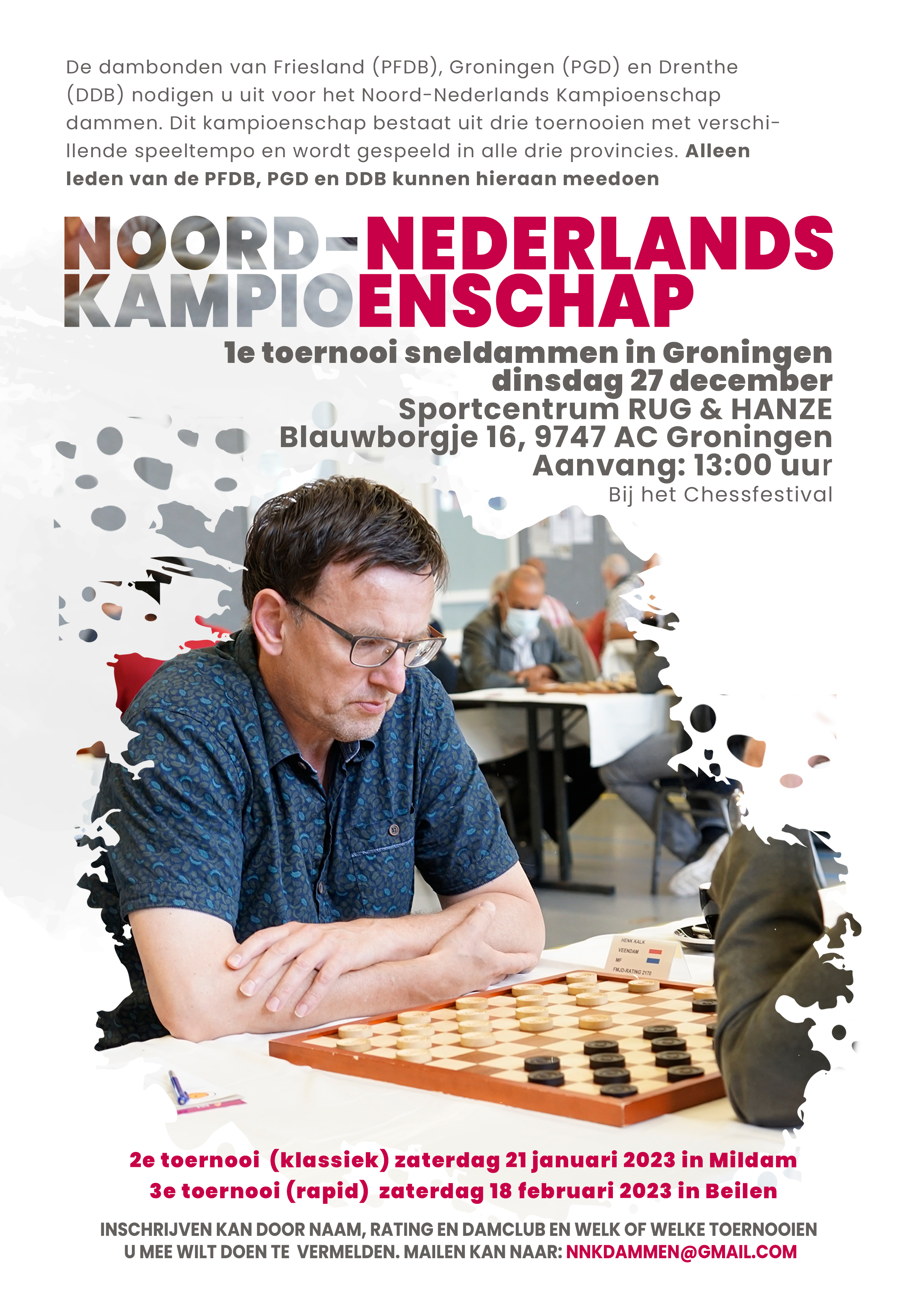 De dambonden van Friesland (PFDB), Groningen (PGD) en Drenthe (DDB) nodigen u uit voor het Noord-Nederlands Kampioenschap dammen. Dit kampioenschap bestaat uit drie toernooien met verschillende speeltempo en wordt gespeeld in alle drie provincies. De locaties zijn zo gekozen dat voor iedereen de reistijd beperkt blijft.